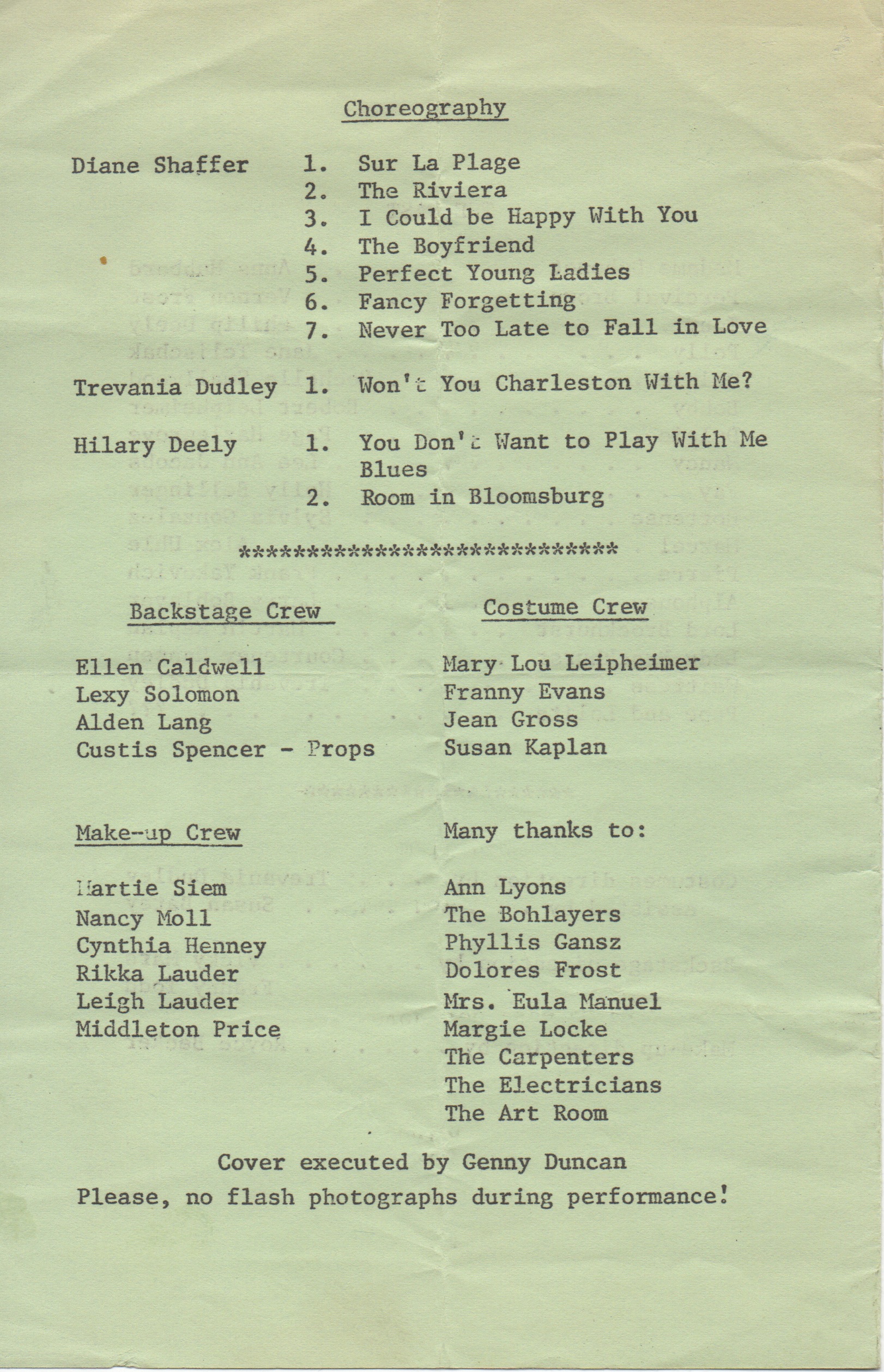 I added to my acting experiences while at Foxcroft. Hilary Deely snagged me early on to appear in a production of To Blush Unseen. The good news is that it allowed me to tell people that I had appeared on stage with Stephanie Zimbalist. I also recall being in a production of The Boyfriend and my last appearance on the Foxcroft stage was in Guys and Dolls in which Wendy Mingst starred as Adelaide. One Mini-Term I worked with Eric VanderVoort in a production of Godspelland Angus Thuermer convinced me to appear in the Middleburg Players production of The Good Doctor.