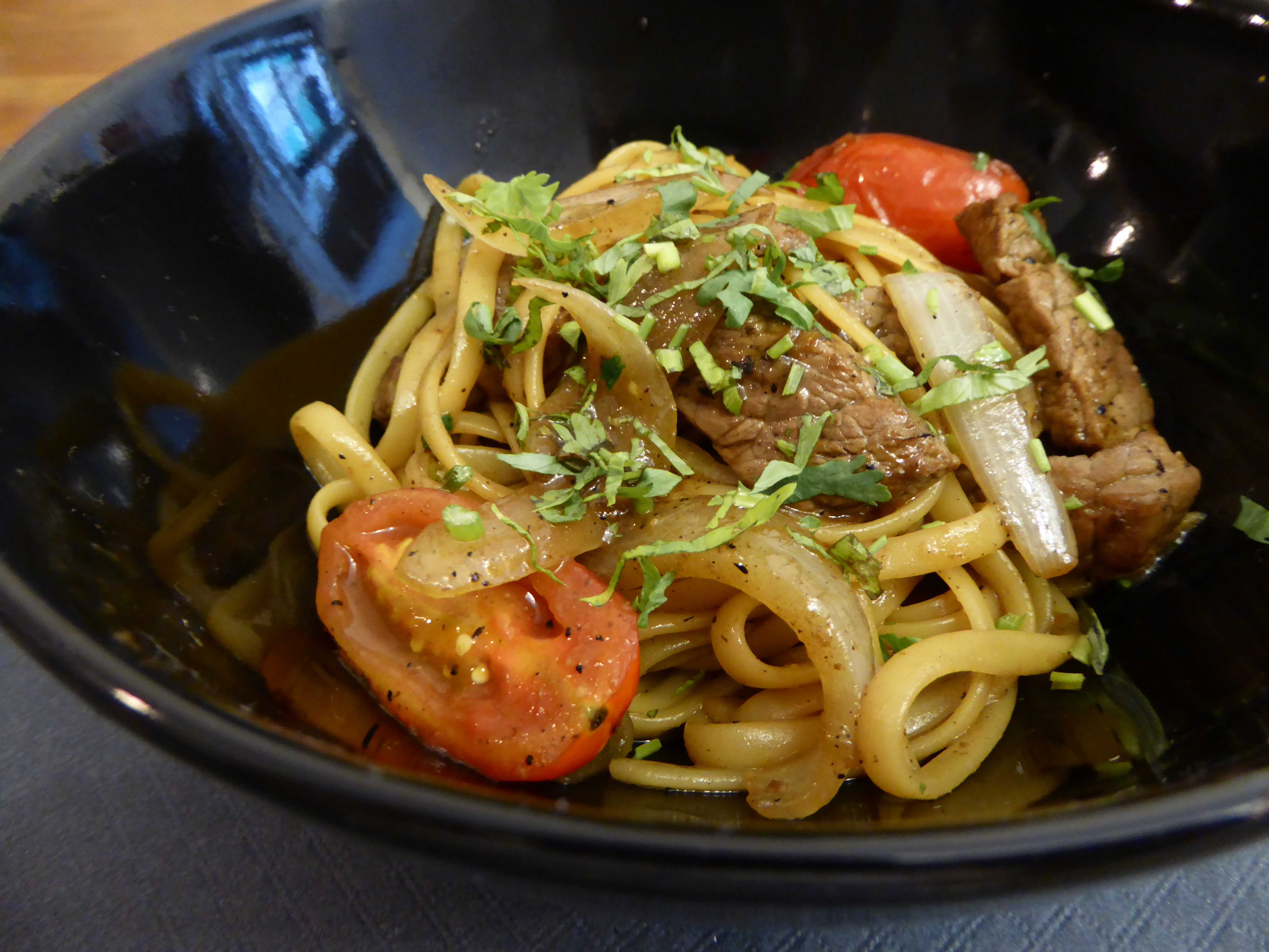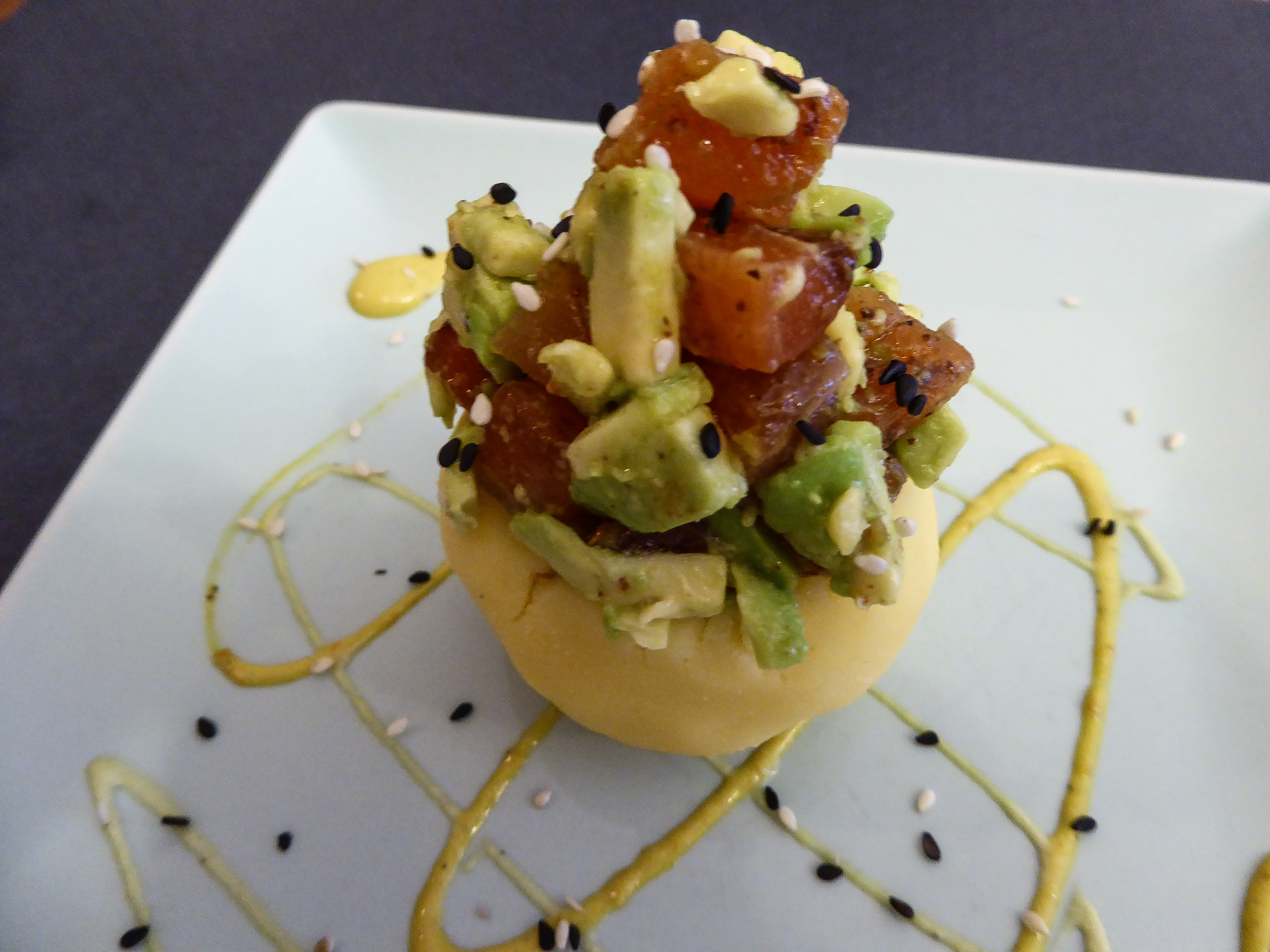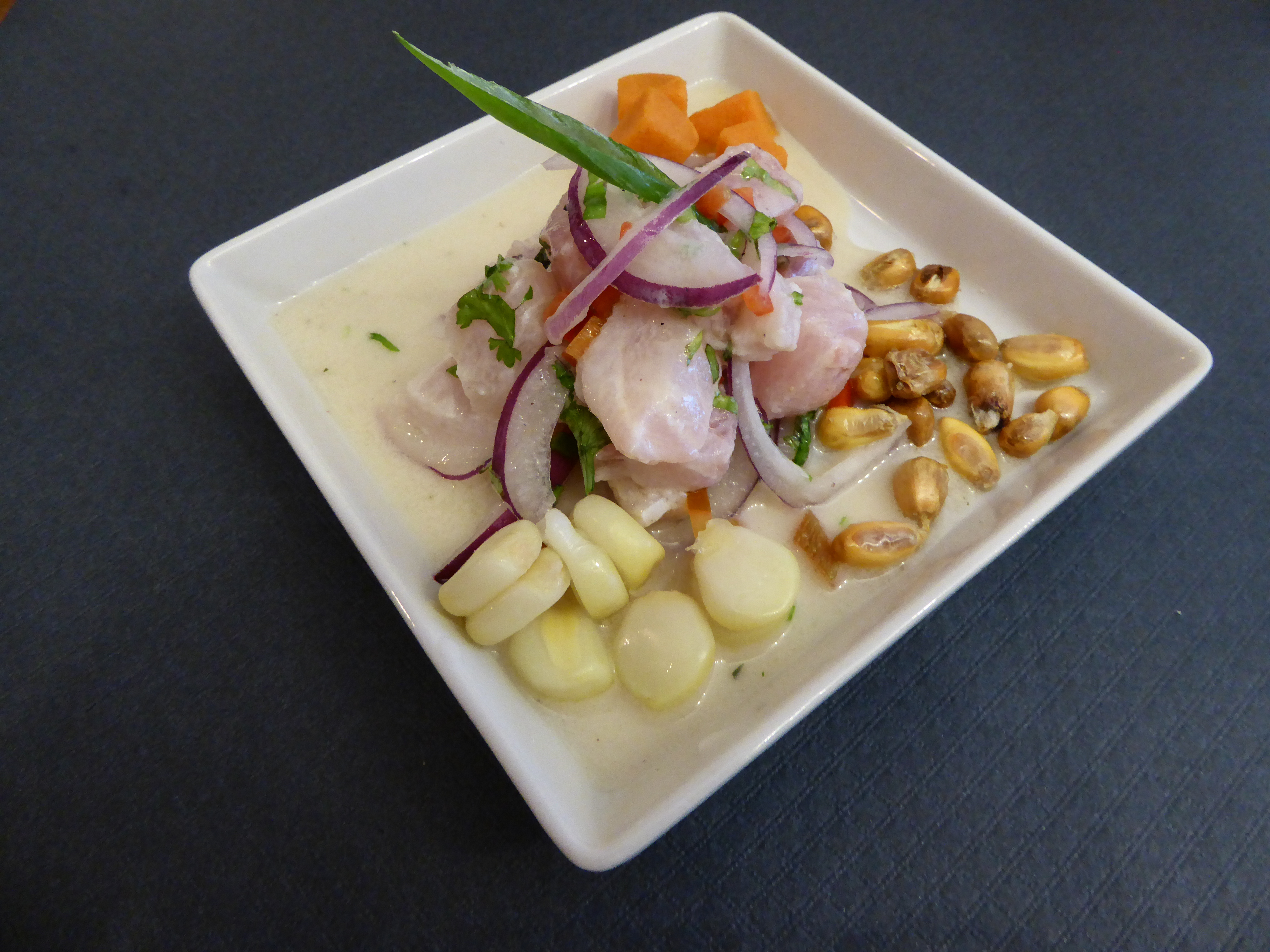 We had our choice of the menu of the day or a tasting menu and we opted for the 20 Euro tasting menu. We started with a croqueta, that was followed by a causa Nikkei (a base of cold mashed potatoes with a center well filled with raw tuna and avocado), ensalada de escabeche Nikkei (a lettuce salad with small pieces of pickled fish), ceviche, a Japanese style beef and noodle dish and a small wedge of lemon pie for dessert. We opted to have coffee elsewhere and left very satisfied with our new discovery.