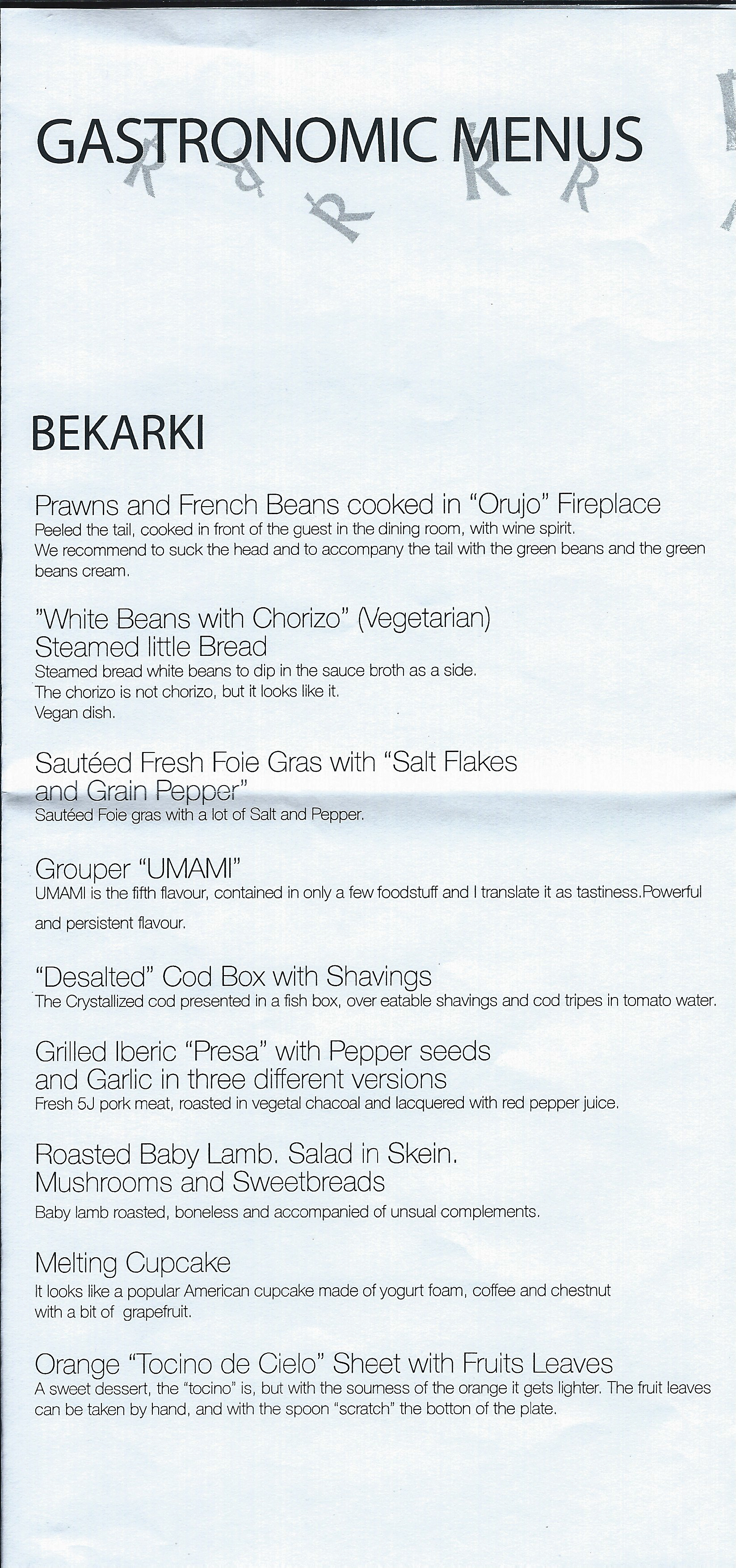 A reservation at Akelare in August is almost impossible unless you have reserved in advance. We had and, as expected, the restaurant was full. Susan and I chose different tasting menus. There is a scan of the menus among the pictures. In honor of our celebration we ordered a bottle of a 2005 Remelluri Gran Reserva. We finished of our meal with champagne and chocolate. We spent a memorable four hours at the restaurant and before we left we had a chance to chat with the owner chef, Pedro Subijana.