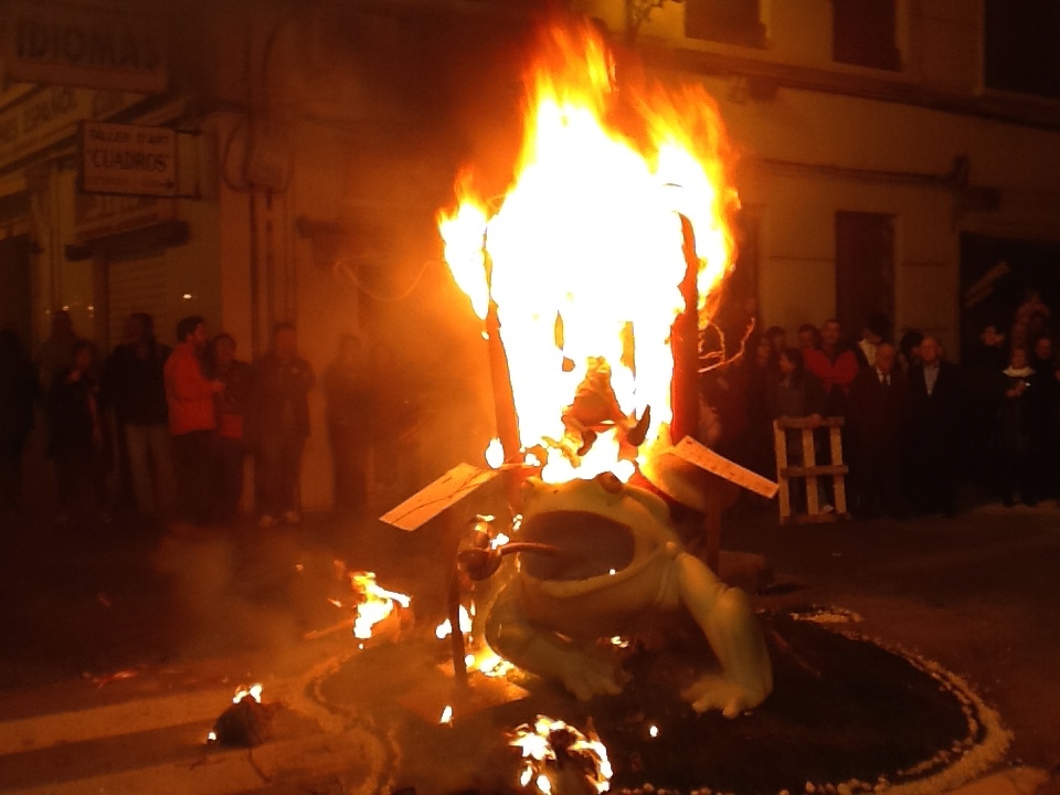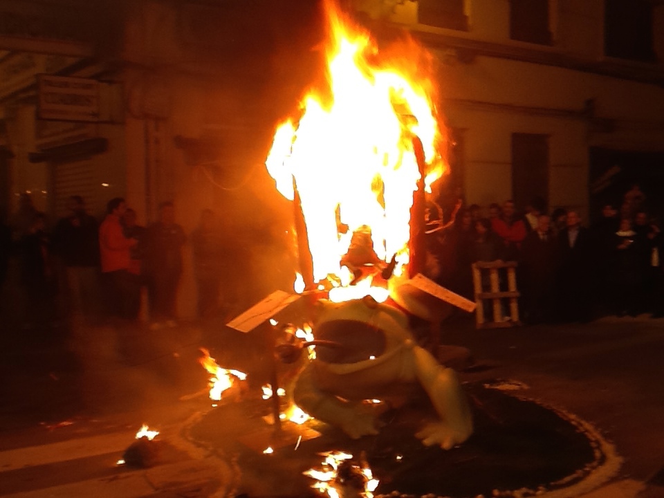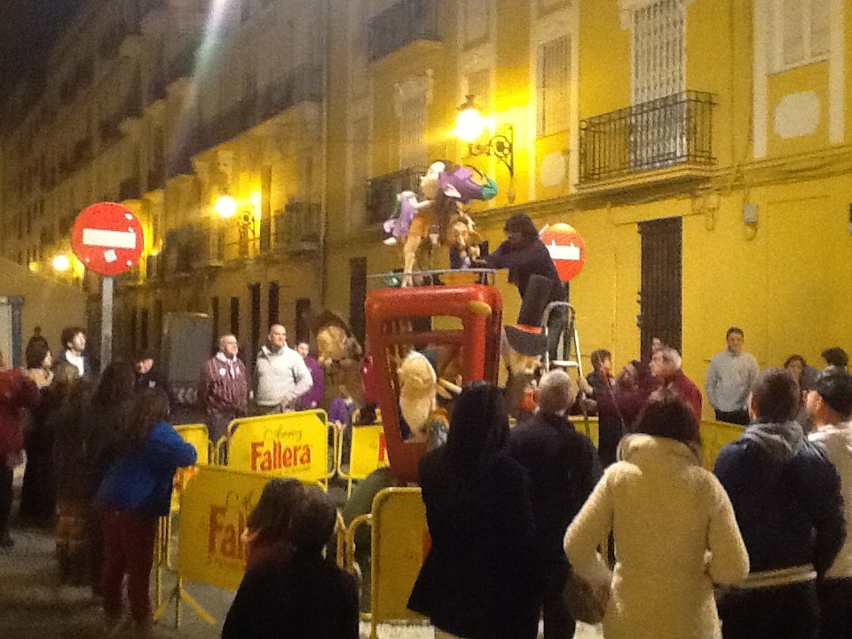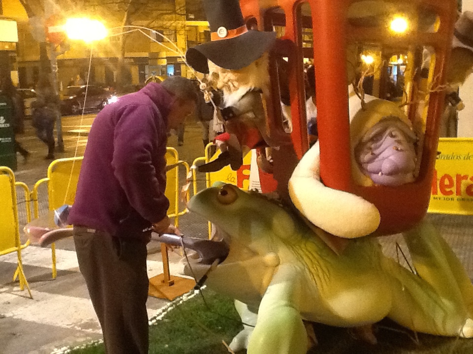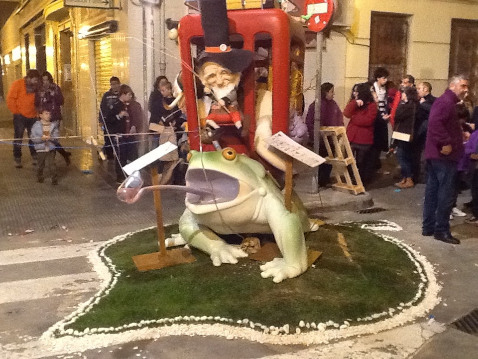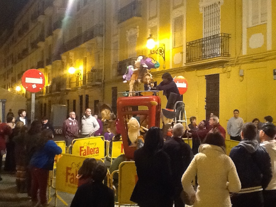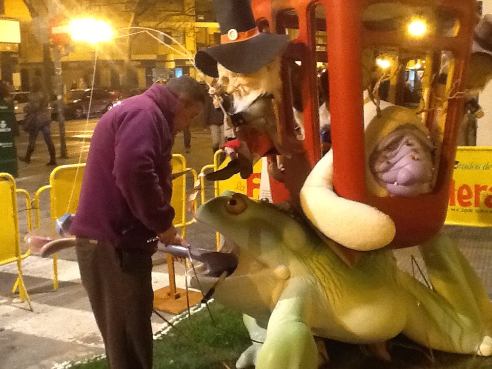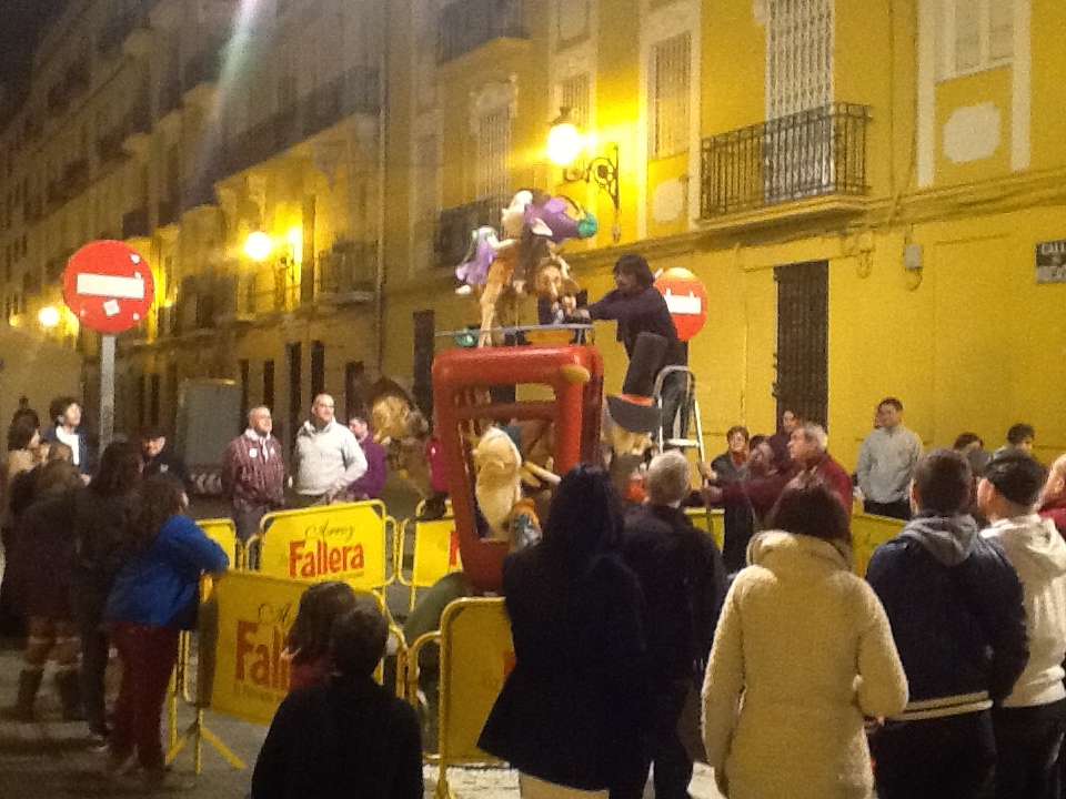 Today we returned to the casal where we are falleros de honor. With the uptick in activity we will be frequent visitors until the celebration has ended. Each casal erects a children’s falla, as well as its main falla. Since most of the fallas are critical and sarcastic there seems to be a certain similarity to the figures that comprise the falla. There are some, however, that are noticeably different. Na Jordana for the previous two years have built absolutely unbelievable fallas constructed, for the most part, out of wood. Two years ago it was an enormous falla that represented the head of Leonardo DaVinci. Here is a video of it being put into place http://www.youtube.com/watch?v=LTw2SSPLGCA Last year it was the Trojan Horse http://www.youtube.com/watch?v=ShXjX9vwj3c . The fallas of the Casal de la Plaza de Jesús are not your typical ones, either.