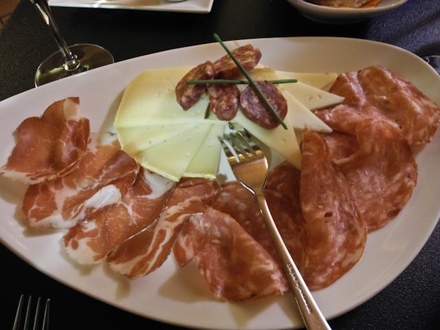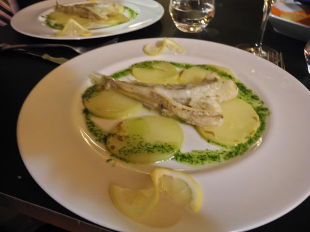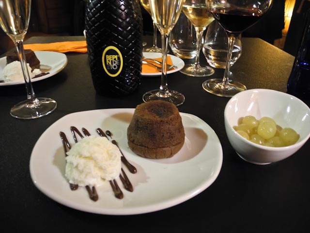 We cleared the tables in order to make room for the next four dishes. Two of the dishes were Jordi Morera creations. One was a stew made with octopus and thistles and the other was a coca crowned with a variety of charcuterie. There were also mini-sandwiches filled with slices of sirloin and a pastry filled with quail. The wine to accompany these four dishes was courtesy of Benjamín Romeo owner of one of the most prestigious wineries in La Rioja. He had sent along magnums of his Predicador wine with special labels for the occasion.
