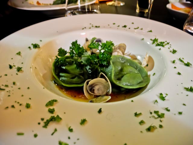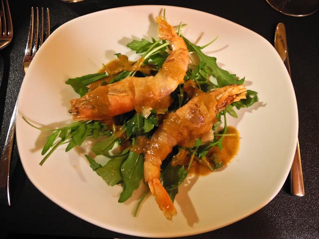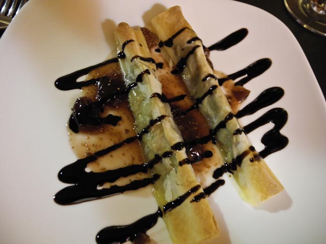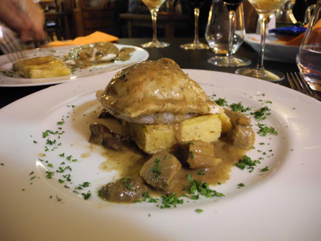 Pepe was the first one through the door at 9:30 and was genuinely surprised when we turned on all the lights and sang Happy Birthday to him. He made his way through the crowd and greeted everyone who was present. As he made his way to the front of the room the sound of champagne corks popping filled the room. After several toasts the first four dishes of the evening made their appearance. There were finger sandwiches filled with a seafood spread, a caviar dip, pastry shells filled with a seafood mixture and a melted Brie with pineapple. The champagne was Pommery and it was the perfect accompaniment to the four starters.